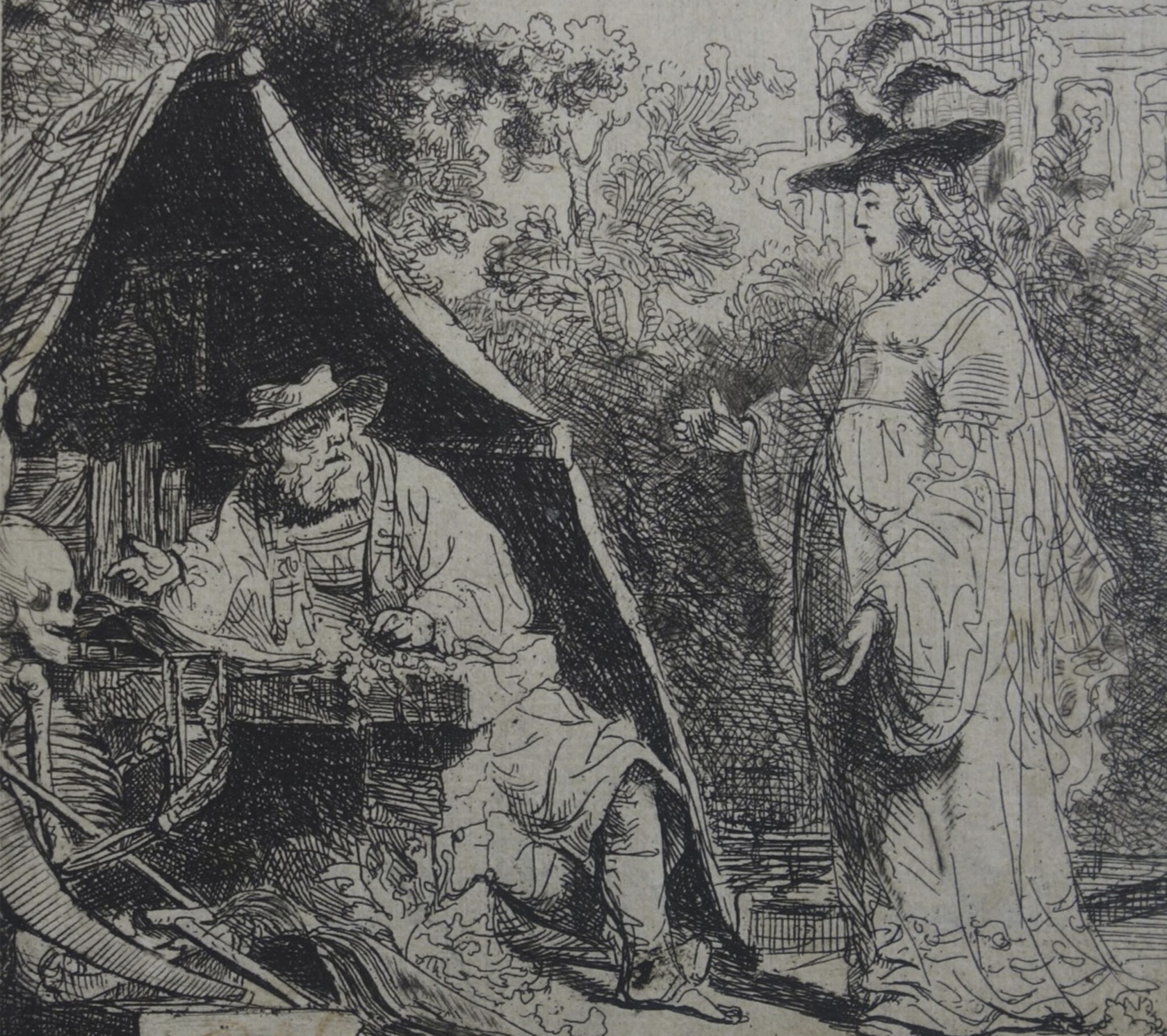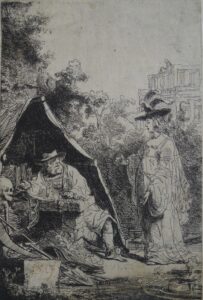 Krul was asking Bol to illustrate a text that he had not yet published, and which he had to share with him. In its introduction, Krul described it as an allegory; it is about a wise courtier (the man in the tent, who has left the Court) who is a reformed sinner and sought to reform the ways of the courtly courtesan sinner (the woman, Florentina). Wijngaards23 concluded that for the portrayal of Florentina, Krul referred to the 1539 treatise decrying court life,24 by the Spanish bishop and writer Antonio de Guevara (c. 1480-1545), which was well-known in The Netherlands at that time. Bol echoed the general composition of one of Rembrandt’s recent etchings, Death Appearing to the Wedded Couple, 1639 (B.109, NH 174), also with a moral message, which he saw take shape during his time in the studio. This was much the same as Bol did with other prints from this period, for instance his Holy Family in a Dark Room of 1643, (H.4) emulating Saint Jerome in a Dark Chamber, 1642, (NH 212) and Bol’s self-portrait, Portrait of an Officer (H.12). In following his master, Bol was wisely cautious in rendering restrained emotions and expressing the action mainly through gestures: the man’s pointing is the theme of Krul’s work, and the woman stretching out her arms suggests that she responds to the man’s urgings.