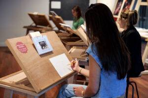 In our drawing studio (on the third floor of the exhibition wing), you can make a drawing just like Rembrandt did. Rembrandt often went outside to draw. He made drawings in the city and in the surroundings of Amsterdam. He sketched landscapes and people, but sometimes also buildings that he found beautiful. In 1654, Rembrandt drew the Montelbaantoren, directly across from his house. Try it yourself in a few simple steps. Drawing tables, drawing materials, and an easy instruction are all set up for you. This activity is free, always available, and suitable for everyone from 6 years old.