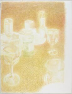 Neda Mirhosseini, Lunch at Fatemeh’s, 2024. Lápiz de color sobre papel. Casa Museo Rembrandt, Amsterdam