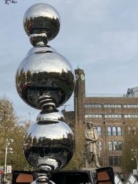 De sculptuur van Westerhuis is als een spiegel. Over je schouder kijkt de beroemdste Nederlandse kunstenaar met je mee: Rembrandt (1606-1669). Hij keek vaak naar zichzelf in een spiegel, wanneer hij in zijn atelier aan zijn zelfportretten werkte. In de sculptuur van Westerhuis zie je niet alleen Rembrandts reflectie. Westerhuis neemt het hele plein mee. Een uitnodiging om ook oog te hebben voor de wereld om je heen.