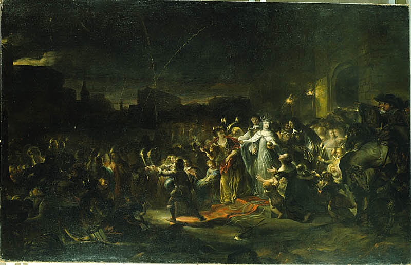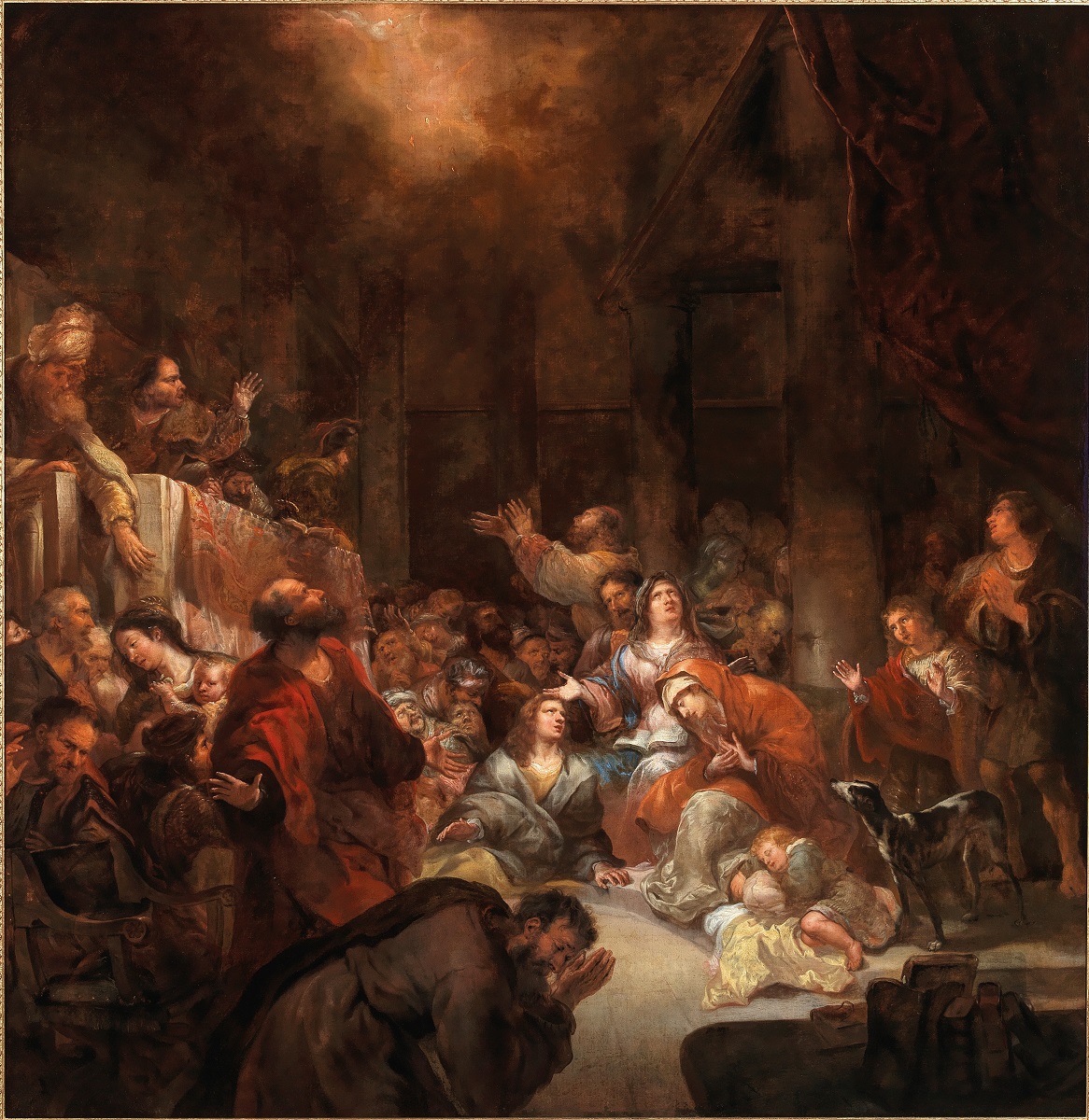 The depicted scene is set in a large room, where the Holy Spirit descends upon the apostles and other followers of Jesus Christ while they are in Jerusalem celebrating the Feast of Weeks, as described in the acts of the apostles (Acts 2:1-13): “When the day of Pentecost came, they were all together in one place. Suddenly a sound like the blowing of a violent wind came from heaven and filled the whole house where they were sitting. They saw what seemed to be tongues of fire that came down to rest on each of them.”. Looking at the manner in which the work is painted, it can be placed mid-century, as it reflects the developments in Amsterdam around this time in the oeuvre of Govert Flinck (1615-1660) and his circle. The fluid, characteristic brushwork in a large part of Pentecost, the depiction of forms, the use of colours, the distribution of light and dark, the handling of space and the compositional scheme recall the style of Flinck’s pupil Ovens. These aspects compare well with his Marriage of Princess Hedwig Eleonora of Schleswig-Holstein-Gottorf with King Charles X of Sweden on the 24th of October 1654, which is signed and has never been questioned (fig. 2).6 The whippet dog in the Pentecost corresponds to the one in this painting, whereas the sleeping boy echoes the small child in the centre of Ovens’s painting of The Procession of the Swedish Queen Hedwig Eleonora of Schleswig-Holstein-Gottorf (fig. 3).7 Furthermore, the boy and dog in the two Eleonora paintings are executed in the same style as those in Pentecost.