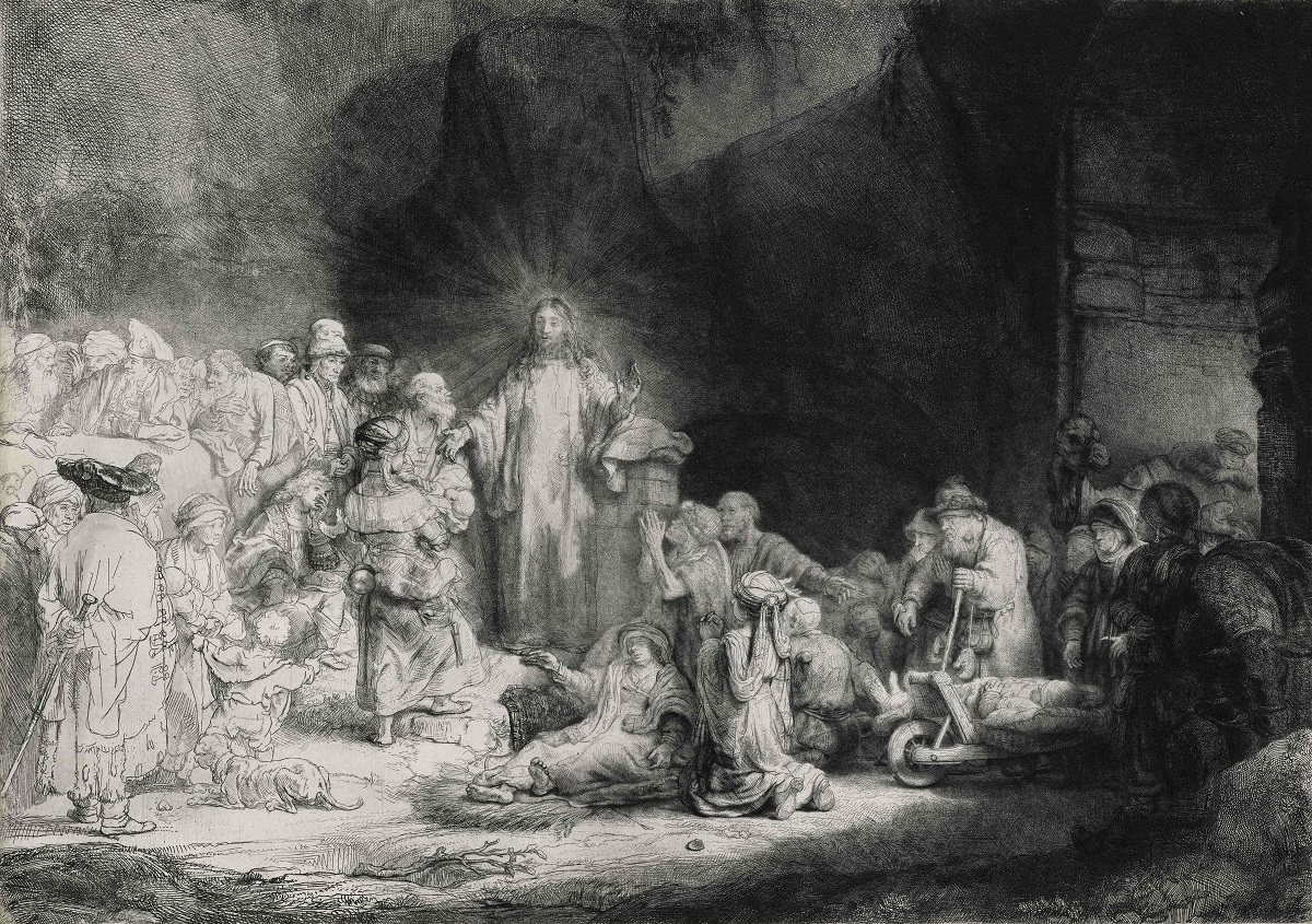 The mother under the painted balcony, carrying her son on her left arm, calls to mind the woman with child on the far right in the etching. They are both positioned at more or less the same location in the composition. An old, bearded man standing close to her and raising his hand to his chest is taken over by Ovens for the figure to the far left. His face in turn resembles that of the apostle Saint Peter in Rembrandt’s Hundred Guilder Print from circa 1648 (fig. 5).11