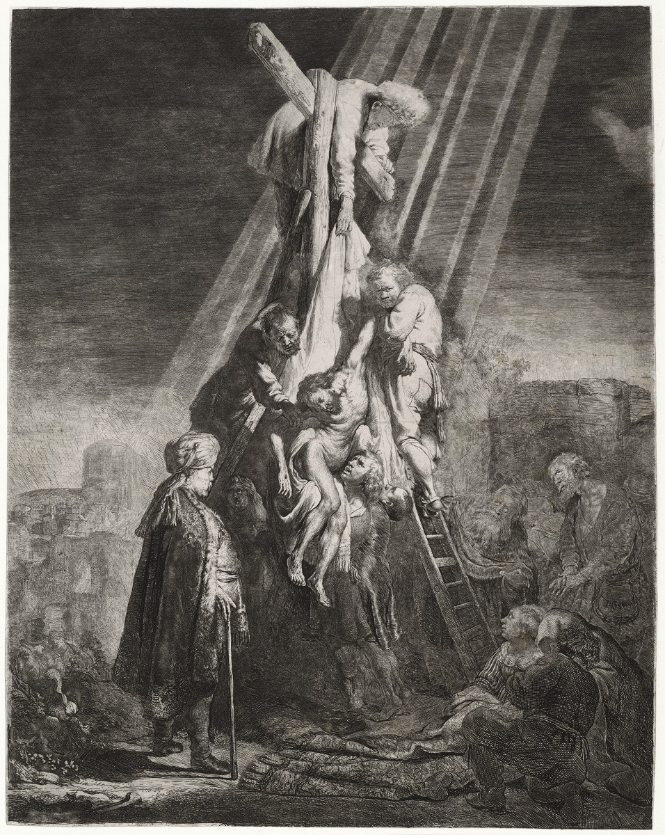 The balding man with outstretched arms in a red robe to the left in Ovens’s painting has stepped out of the Hundred Guilder Print, where he kneels behind Christ. In the etching he turns his eyes to the Saviour, but in the painting he looks up to the Holy Spirit. Ovens granted this figure a more prominent role, uniting the foreground with the middle ground, thereby drawing the viewer into the picture.13 Ovens would return to the Hundred Guilder Print a decade later in two drawings of The Raising of Lazarus (John 11:1-44) , in which he adapts Christ and the surrounding figures.14 These sheets testify to his enduring admiration for this masterpiece etching.