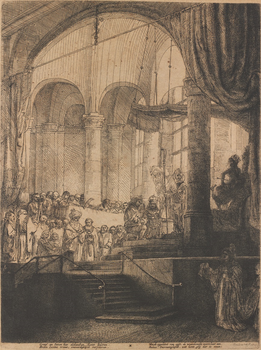 It is most interesting to note that Ovens composed parts of this work by borrowing from no less than seven of Rembrandt’s religious prints. Most obviously, he was inspired by the etching of The Triumph of Mordecai (c. 1641) for the low, draped balcony, in mirror-image, as well as by the motif of the carpet thrown over a white sheet, and even its pattern of wavy lines, rendered in red (fig. 4).10