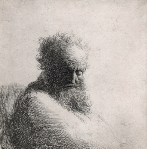 Rembrandt, Oude man, naar beneden kijkend, 1631. Ets. Museum Rembrandthuis.
